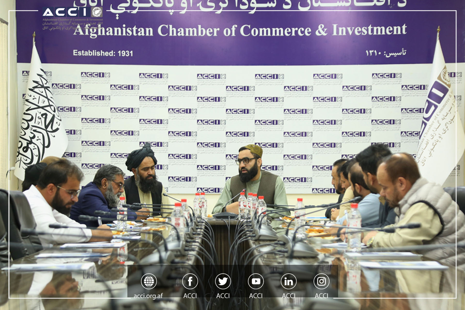 محترم محمد ولی امینی رئیس هیات عامل اتاق تجارت و سرمایه گذاری افغانستان، در حضور داشت جمعی از مسوولان دیپارتمنت های مختلف اتاق با محترم مولوی محمد حنیف آخندزاده رئیس انکشاف و تدوین ستندرد های اداره ملی ستندرد افغانستان و تیم همراه شان در تالار کنفرانس های اتاق ملاقات کرد.