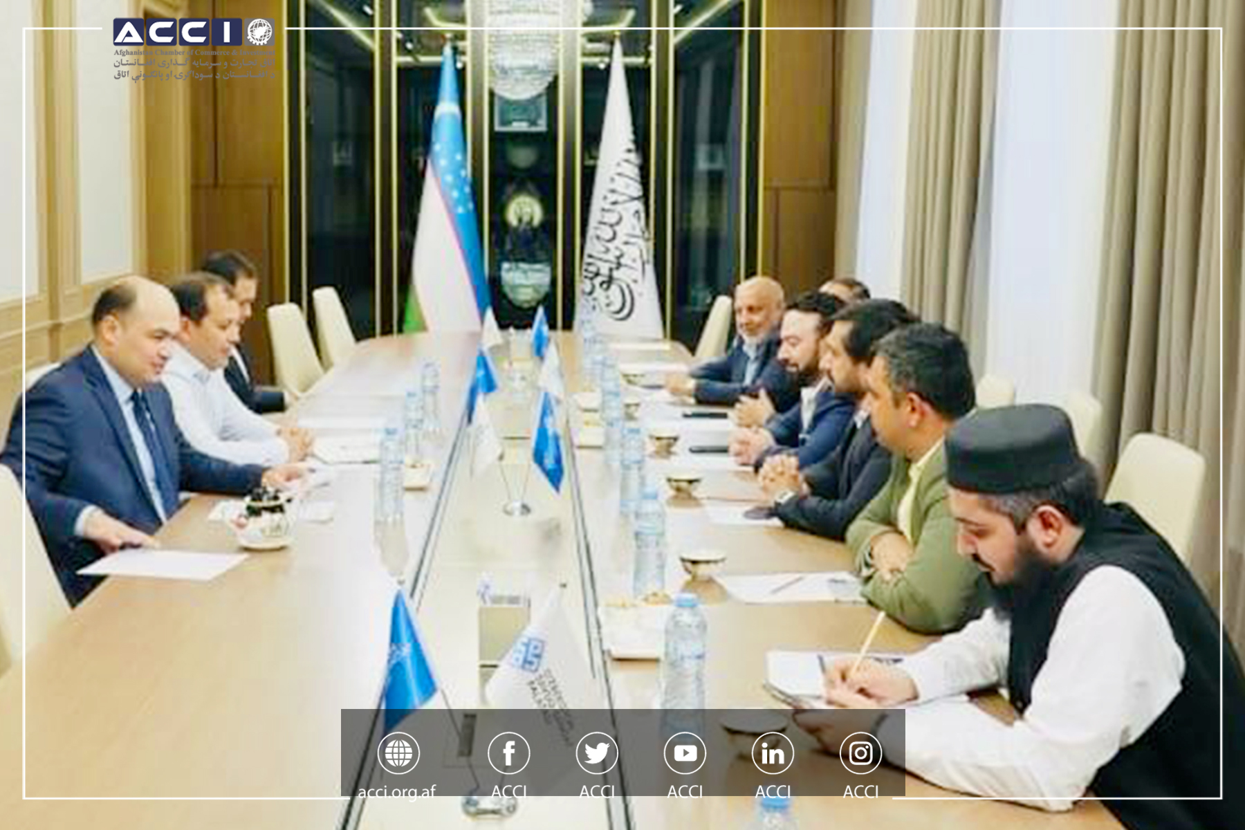 محترم آرین زلگی عظیمی معاون سرمایه گذاری اتاق تجارت و سرمایه گذاری افغانستان طی سفری کاری خویش به کشور ازبیکستان، درحالیکه جمعی از تاجران مطرح کشور نیز ایشان را همراهی میکردند، با محترم دوران وهابوف رئیس اتاق تجارت و صنایع ازبیکستان در شهر تاشکند ملاقات کرده و پیرامون توسعه تجارت و همکاری میان اتاق های تجارت دو کشور بحث و گفتگو نمود.