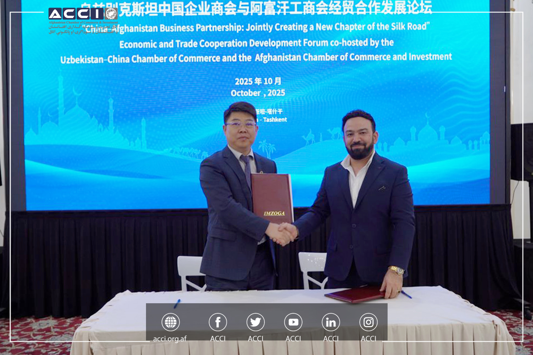 نشست تجارتی مشترک میان اتاق تجارت و سرمایه گذاری افغانستان و اتاق مشترک ازبکستان – چین با حضور داشت محترمان: آرین زلگی عظیمی معاون سرمایه گذاری اتاق، عبدالله رحیمی و عبدالصبور احمدی اعضای هیأت مدیره اتاق و لیو رئیس اتاق مشترک ازبیکستان – چین و جمعی از تاجران افغان و چینی در شهر تاشکند برگزار گردید.