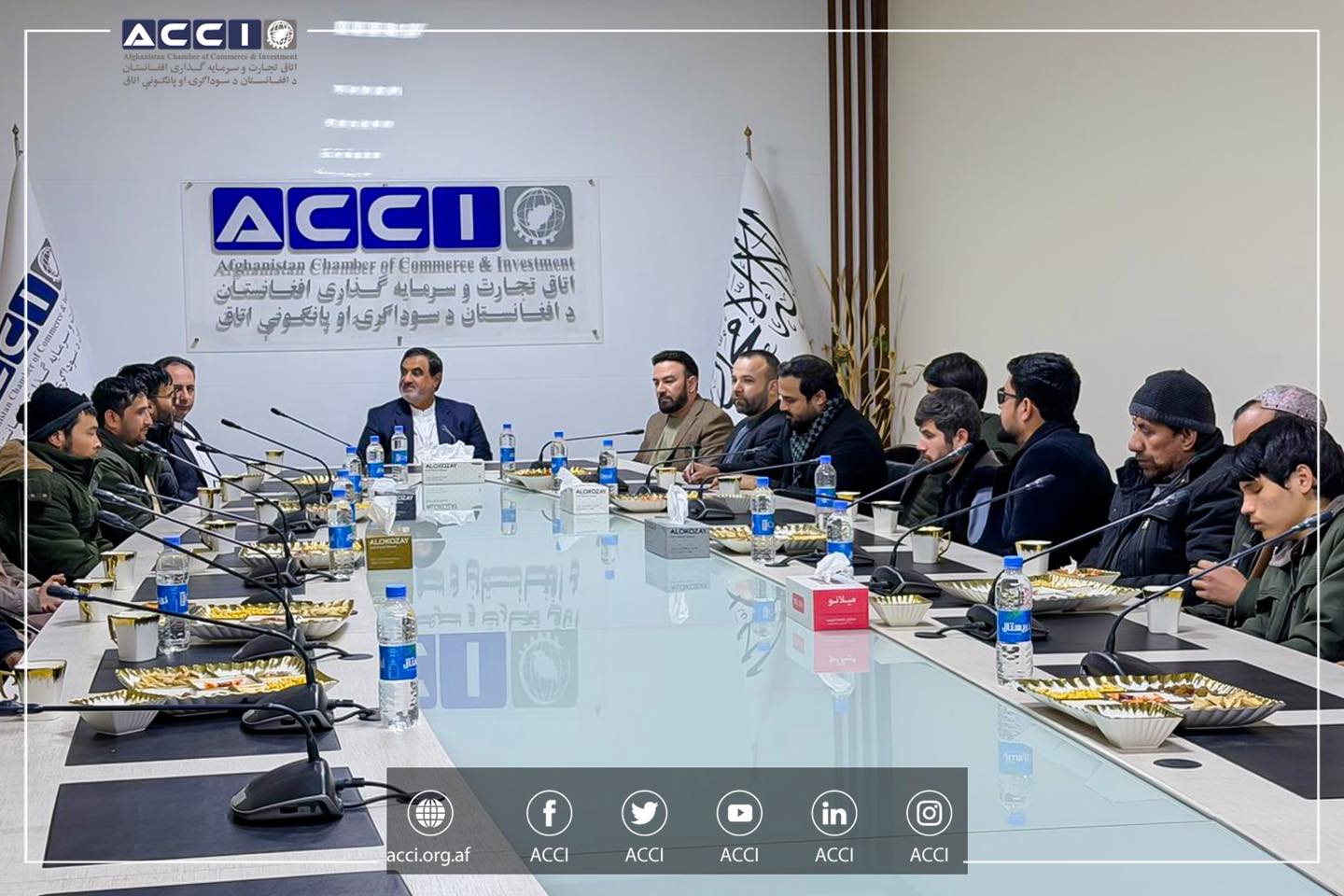 محترم الحاج سید کریم هاشمی رئيس عمومی اتاق تجارت و سرمایه گذاری افغانستان، در حالیکه محترمان: الحاج میراجان سلیمان خیل معاون پالیسی، الحاج آرین زلگی عظیمی معاون سرمایه گذاری و الحاج حمیدالله حبیبی عضو هیئت مدیره اتاق نیز حضور داشتند، با محترم سید محمد یزدانی مسئول انجمن نابینایان ولایت بلخ و تعدادی از اعضای آن، در دفتر ریاست عمومی، ملاقات کرد.