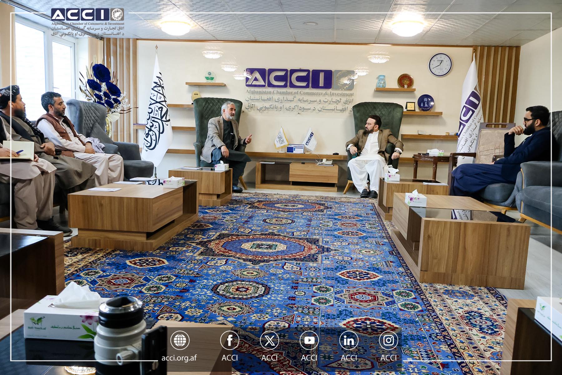 محترم الحاج آرین زلگی عظیمی معاون سرمایه گذاری و محترم محمد ولی امینی رئیس هیئت عامل اتاق تجارت و سرمایه گذاری افغانستان با محترم عبدالمتین قلندری رئیس دارالانشای اتاق صنایع و معادن و تعدادی از تولید کنندگان بطری کشور، در دفتر مرکزی اتاق ملاقات کردند.