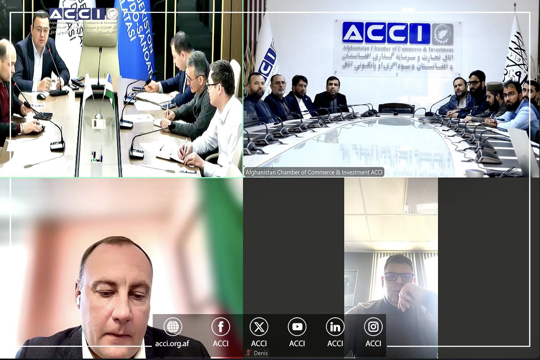 محترم الحاج عبدالنافع بارکزی، سرپرست اتاق تجارت و سرمایهگذاری افغانستان و تعدادی از اعضای رهبری این اتاق، با محترم سهروب عبدالرحمانوف، معاون رئیس اتاق تجارت و صنایع ازبیکستان در امور روابط اقتصادی و خارجی و تیم همراه شان به گونه آنلاین دیدار و گفتگو نمودند.