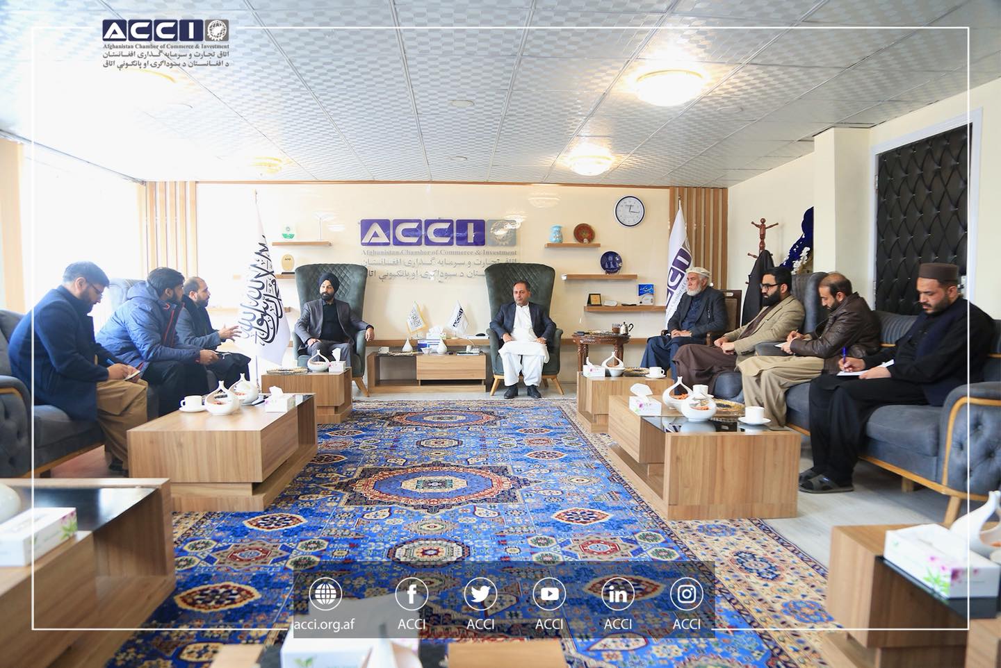 محترم محمد یونس مهمند معاون اول اتاق تجارت و سرمایه گذاری افغانستان، در حضورداشت محترم صمیم هاشمی مسوول دیپارتمنت روابط با دولت اتاق، با محترم حاجی مسعود راحت عضو هیات مدیره اتاق کندهار و تعدادی از مالکان تانک های تیل کابل ملاقات کرده و مشکلات شان را استماع نمود.