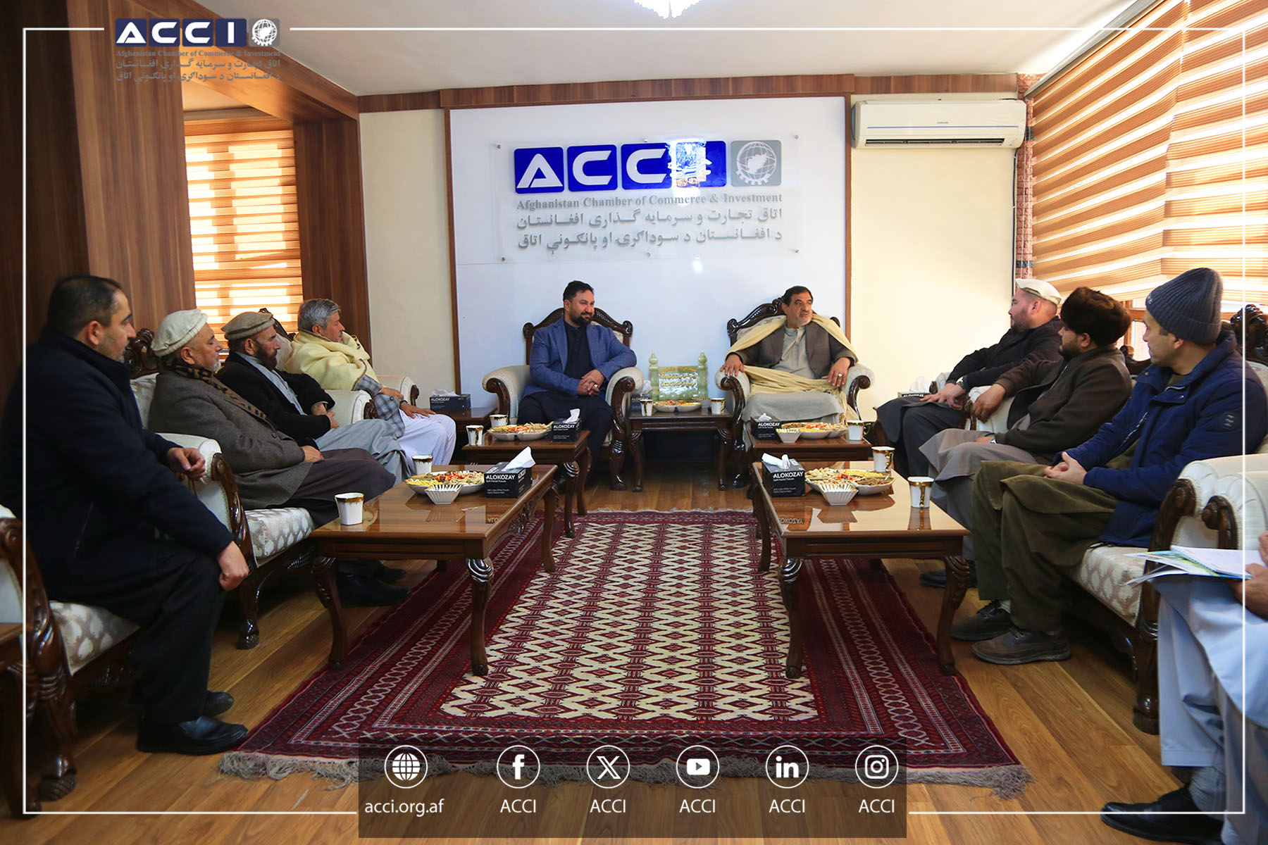 محترم خان محمد سرفراز باز رئیس دارالانشاء هیات مدیره اتاق تجارت و سرمایه گذاری افغانستان با محترمه دینای بوگاس مسوول برنامه های اقتصادی دفتر یوناما در کابل و همکاران شان در دفتر ریاست دارالانشاء ملاقات کرده و در رابطه به موضوعات مختلف، از جمله: کاهش کمک های بشری از طرف جامعه جهانی برای مردم افغانستان، همکاری های جامعه جهانی برای رشد تجارت وصنعت در افغانستان و هم چنان آزاد سازی پولهای منجمد شده مردم افغانستان از سوی جامعه جهانی بحث و تبادل نظر نمود.