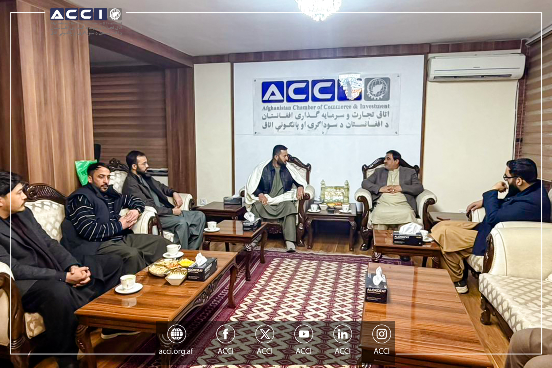 محترم الحاج سید کریم هاشمی رئیس عمومی اتاق تجارت و سرمایهگذاری افغانستان، با محترمان: نیکولای ویف گین مسئول بخش اقتصادی سفارت روسیه برای افغانستان و هیئت همراه وی، در دفتر ریاست عمومی اتاق ملاقات کرده و پیرامون گسترش همکاریهای اقتصادی و تجاری میان افغانستان و روسیه بحث و تبادل نظر نمودند.