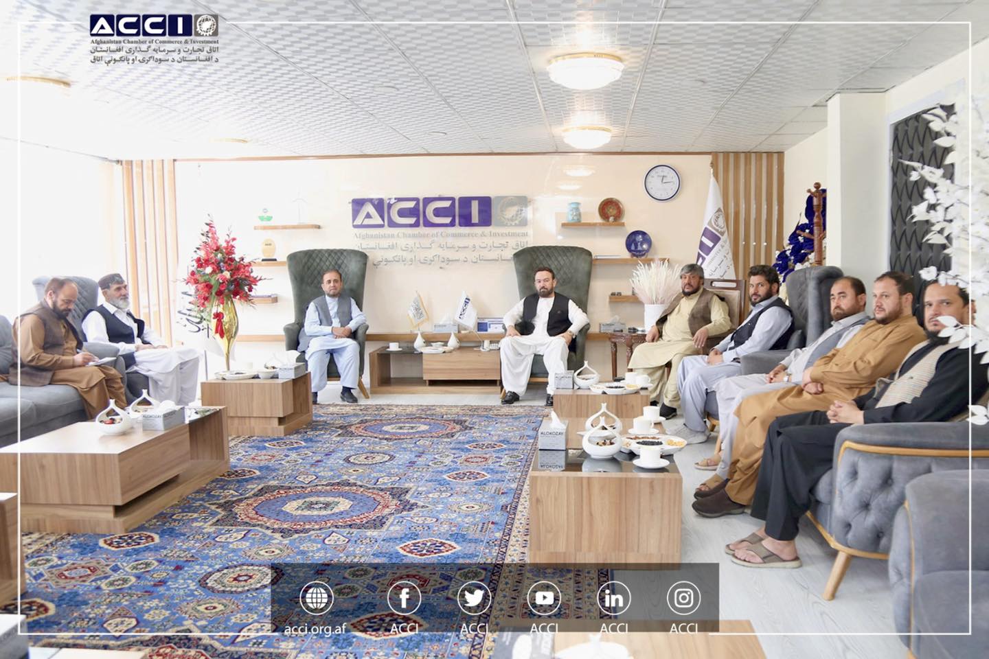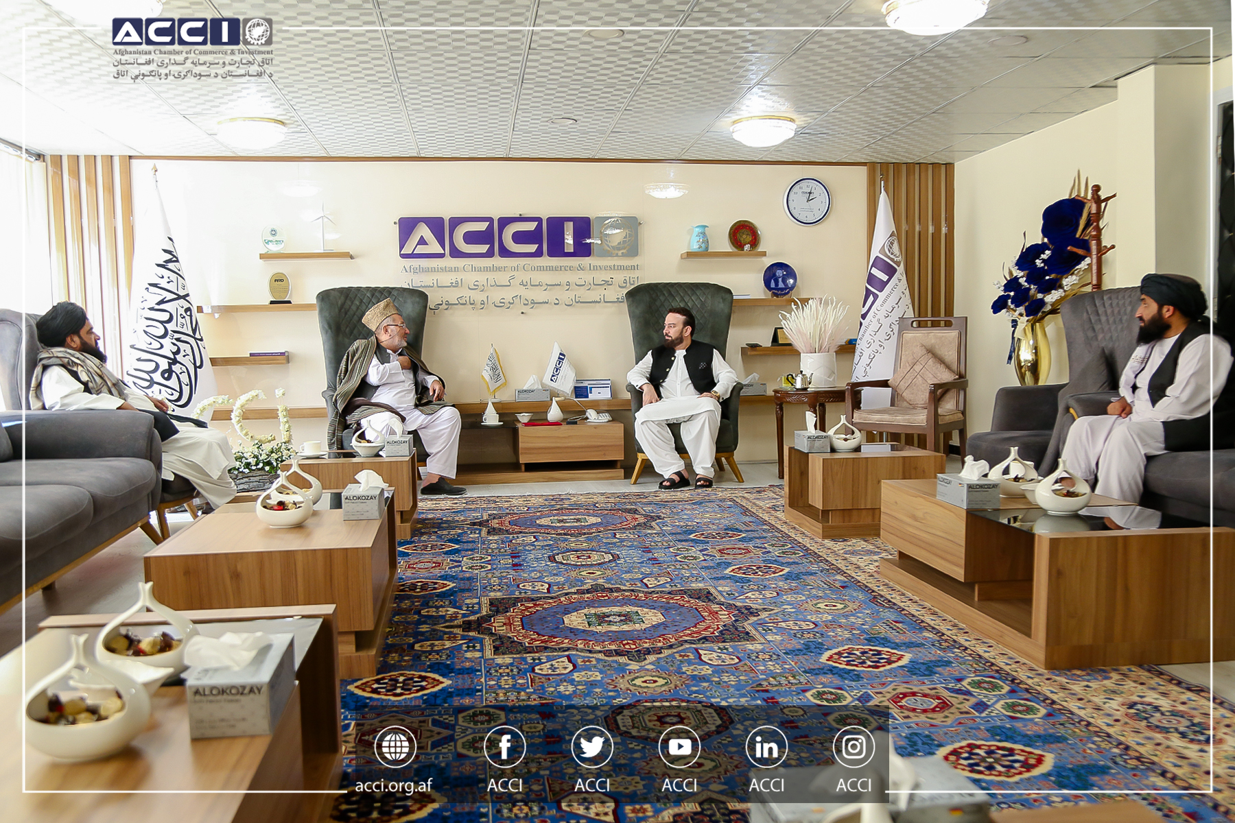 محترم خیرالدین مایل احمدی معاون تجارتی اتاق تجارت و سرمایه گذاری افغانستان و شماری از رؤسای اتاق های ولایتی به منظور حل مشکلات تاجران کشور با محترم مولانا محمد ناصر آخوند معین عواید و گمرکات وزارت مالیه و محترم انجنیر عبدالله رئیس عمومی گمرکات ملاقات کرده و در رابطه به مشکلات تاجران بحث و گفتگو نمودند.